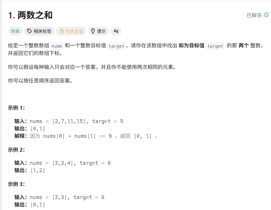 由于不能使用两次相同的元素,所以我使用了hashmap的方式。首先遍历数组,如果目标值target减去数组中的值存在于map中,则直接返回目标值减去数组中的值所在的索引和当前的索引i,如果不存在则将当前的值和索引存入map。
